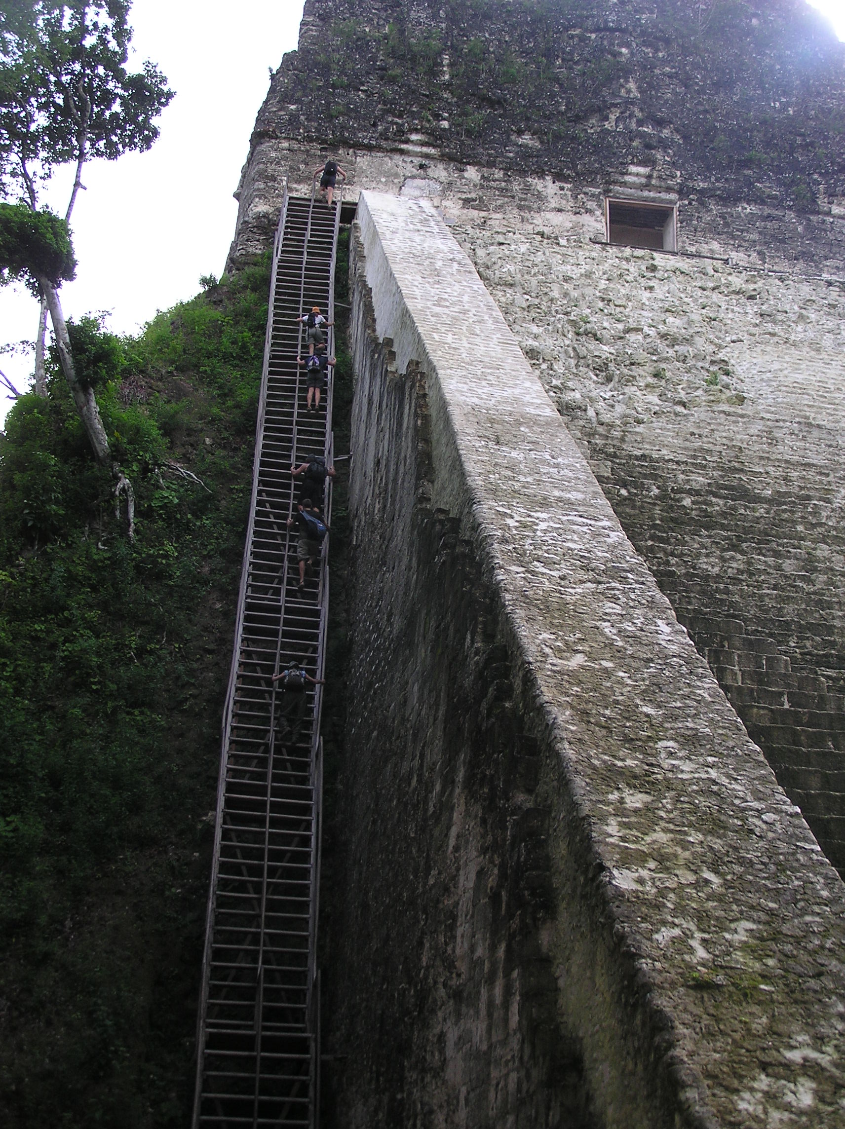 Vysoká vzdušná vlhkost, žhavé sluníčko a pak i lezení na pyramidy znamenalo pro všechny totálně mokrá trička. Nejvyšší z pyramid byly uzavřeny pro veřejnost, ale objevili jsme jednu 58 metrů vysokou (Temple V) na kterou byl povolen vstup, teda jen po dřevěném žebříku na boku.