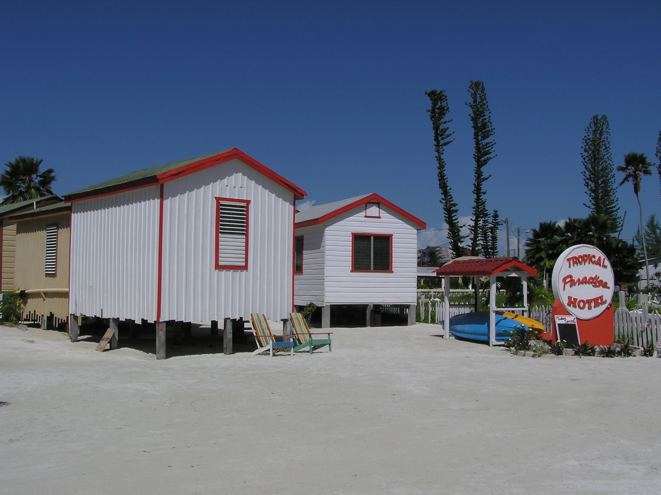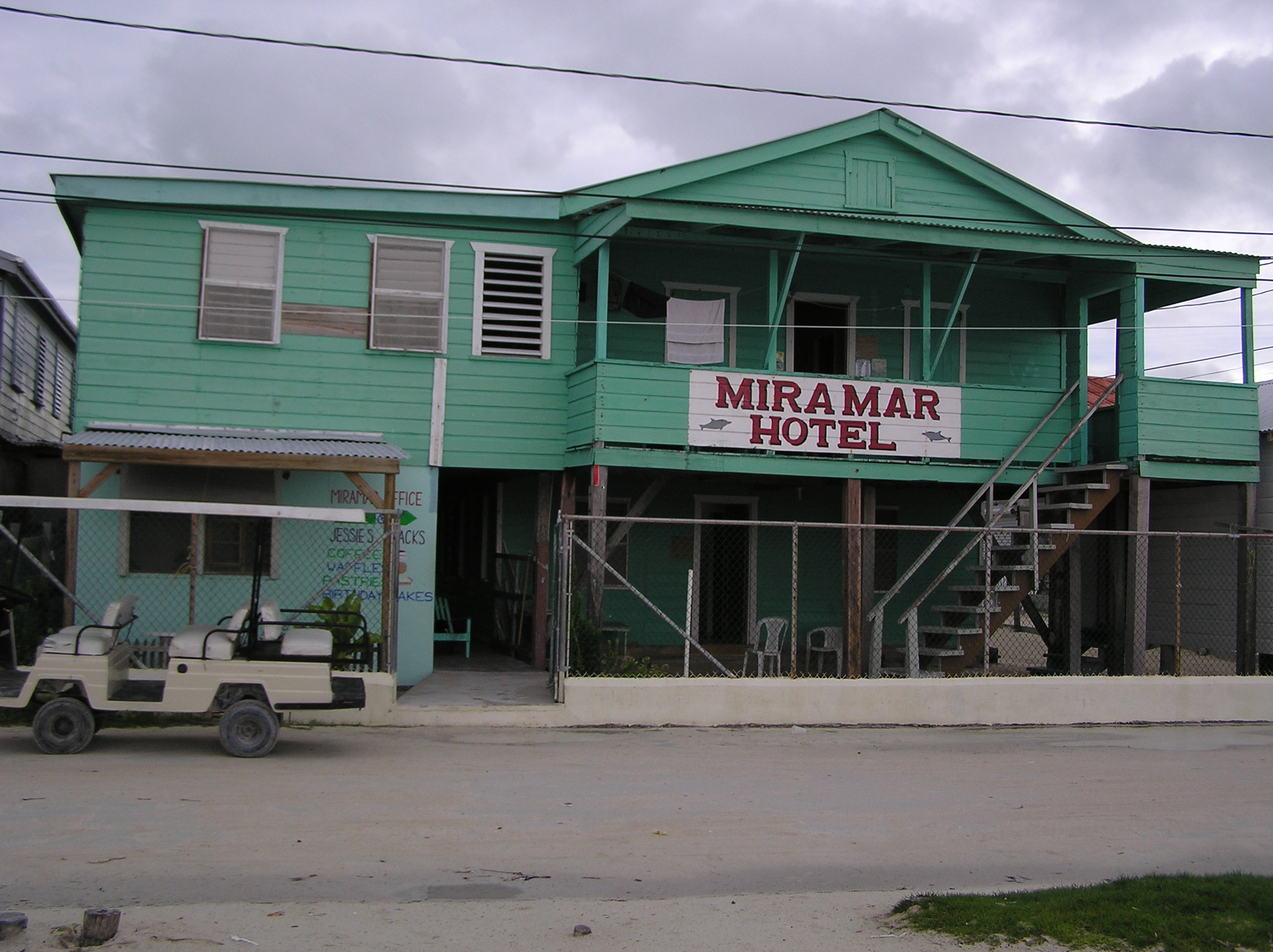 Teď zbývalo najít slušný a levný hotel, kde přespíme několik nocí v karibském ráji. Dle LP jsme měli vyhlídnutý hotel Albert, ale ten, jak se ukázalo, byl již naprosto plný. O 10 metrů dále však byl hezký hotel Mira Mar. Majitelka nám nabídla vcelku čistý pokoj s opravdu malou koupelnou, avšak čistý a navíc venku byla prostorná veranda s houpačkou. A to vše za rozumné peníze (15BZ/os). Zaplatili jsme si dvě noci, vybalili věci, rozložili spacáky a šli si prohlédnout ostrov, na kterém stále žije ani ne 800 lidí. Původně 6 km dlouhý ostrov byl před lety rozdělen hurikánem Hattie na dvě části z nichž je nyní jen jedna obyvatelná. Nejširší část ostrova má 600 metrů a nejužší jen pouhých 200 metrů. Na délku je obyvatelná část dlouhá cca 800 metrů.