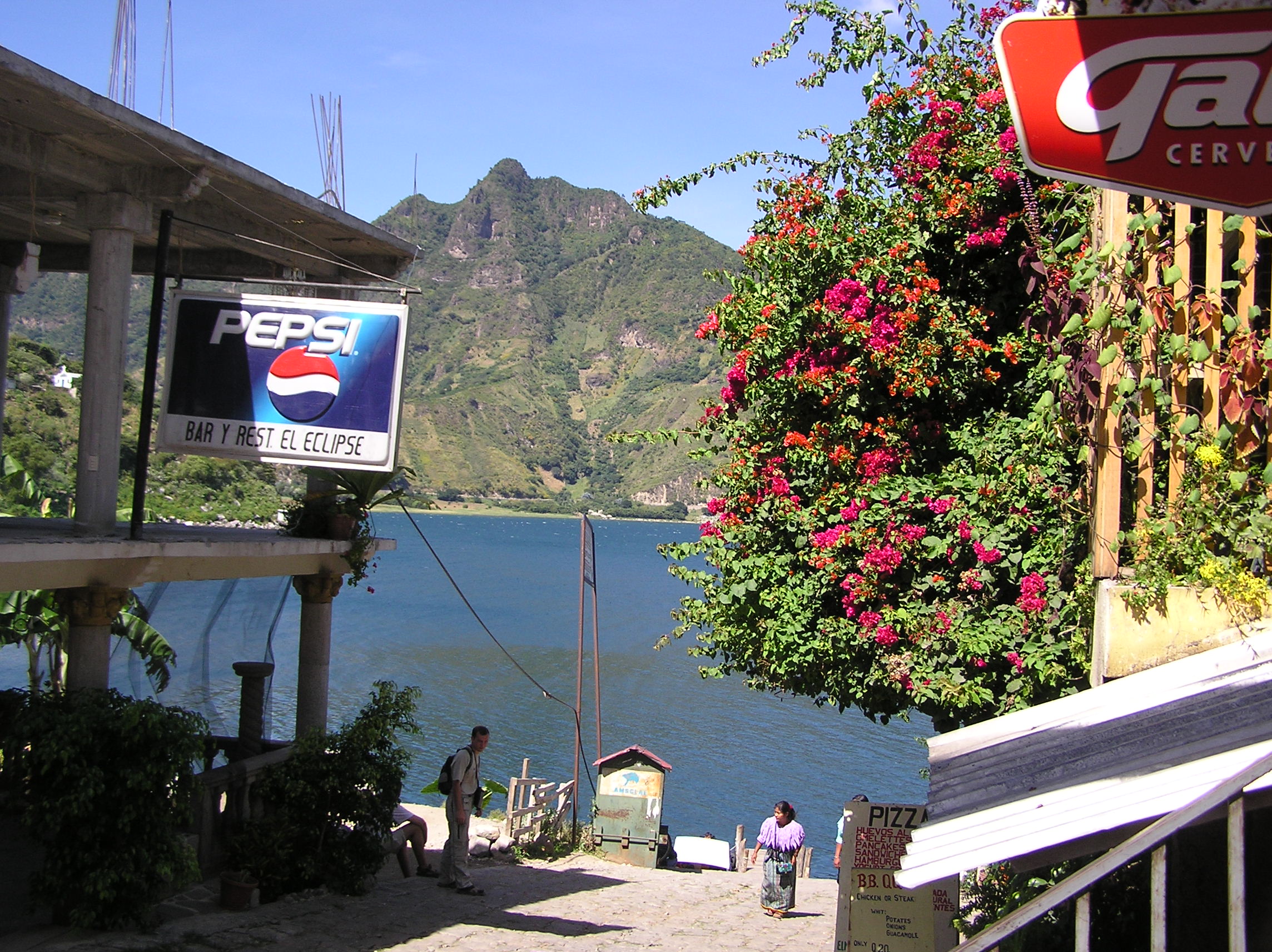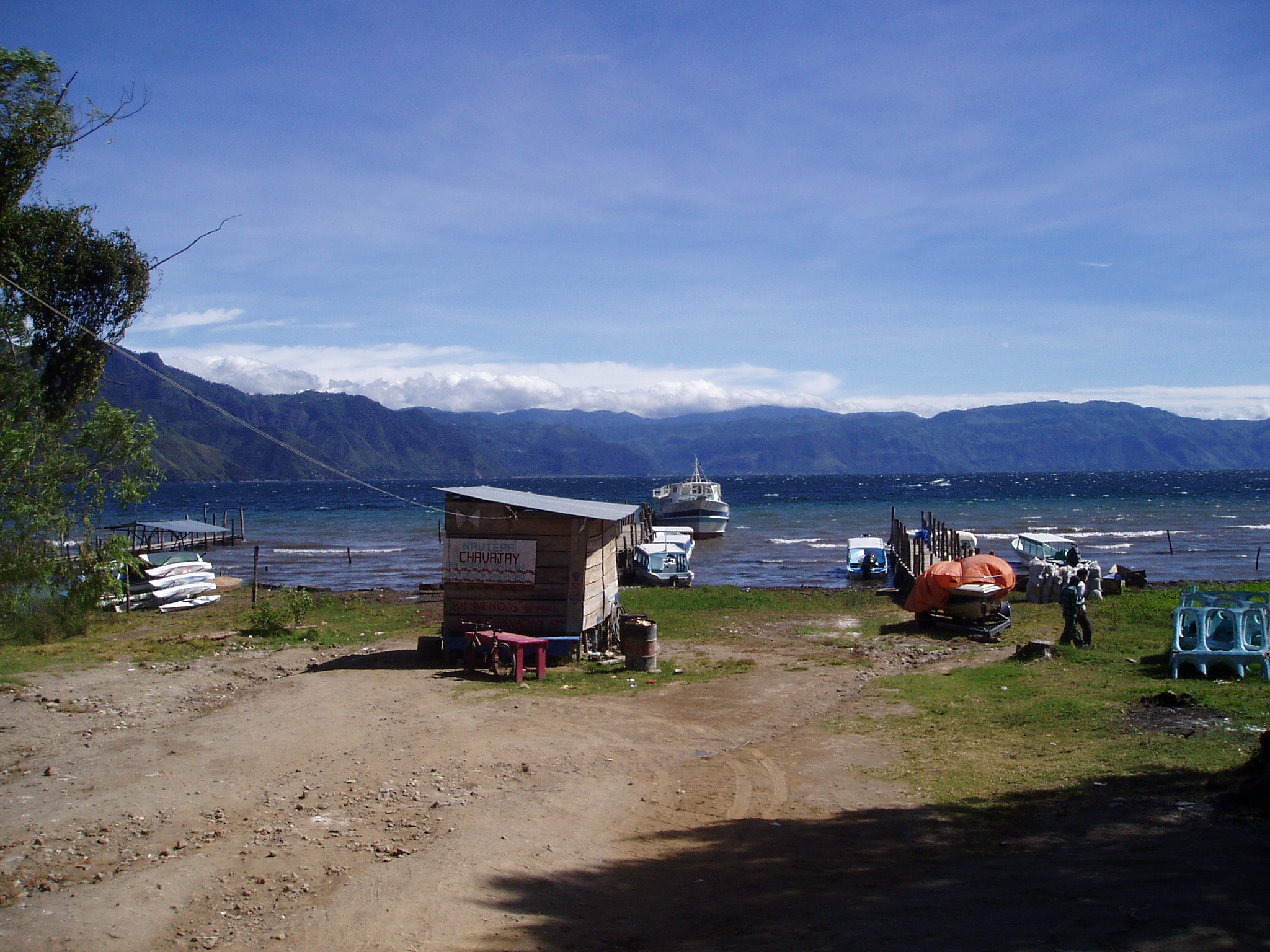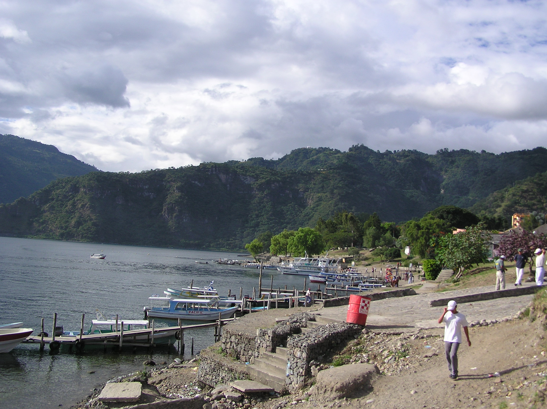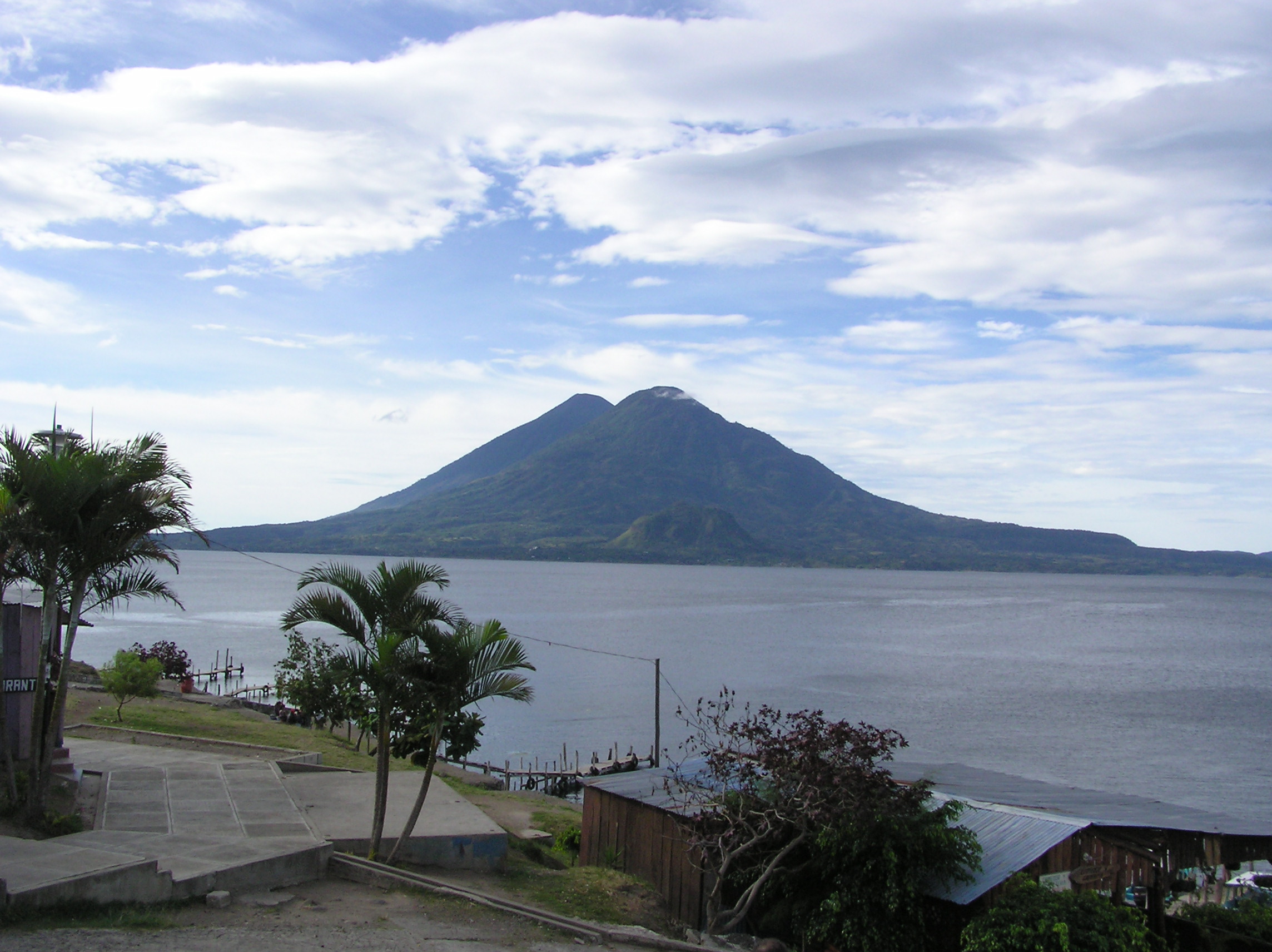 Konečně jsme zahlédli kalderové jezero Atitlán, na jehož břehu leží malá vesnička Panajachel. Dle LP jsme si vybrali hotel Hospedaje de Viajero za 120Q za pokoj. Jelikož jsme byli docela unavení, vzali jsme si rovnou dvě noci. Pavel se šel vyspat a já s Honzou jsme prošli město. Hledali místo ze kterého by jsme pozítří měli jet směrem k mexické hranici. Nakonec jsme zjistili, že lístek si koupíme až zase v autobuse a asi budeme 3x přestupovat. Cestou zpět jsme zjistili slušnou cenu 50Q/os za výlet lodí po jezeře Atitlán.