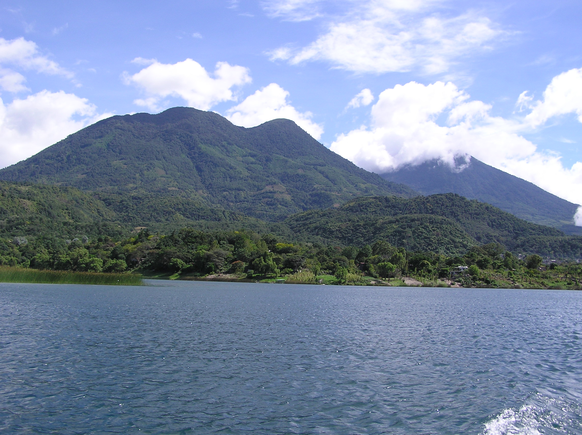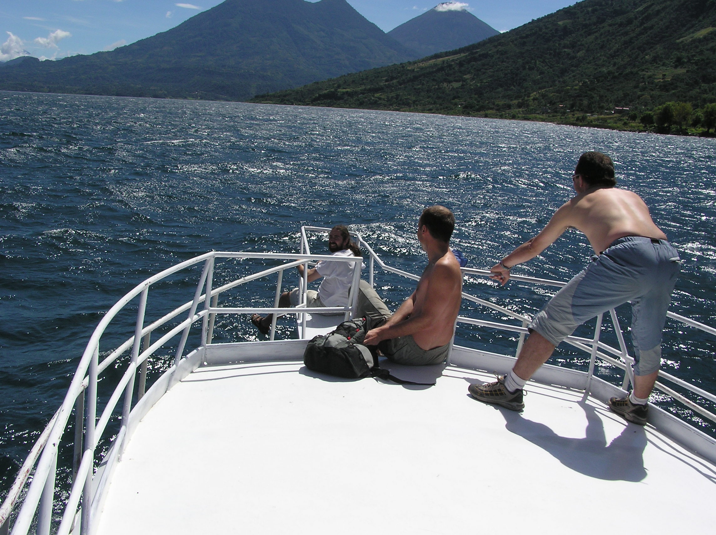 Nalodili jsme se opět na loď a vyrazili směrem k druhé zastávce ve vesničce Santiago Atitlán, která leží na úpatí tří sopek: Cerro de Oro, Volcán Tolimán (3.158 m.n.m.) a nejvyšší Volcán Atitlán (3.537 m.n.m.). Cestou foukal vítr proti což, na normálně klidné hladině jezera, způsobovalo docela slušné vlny.