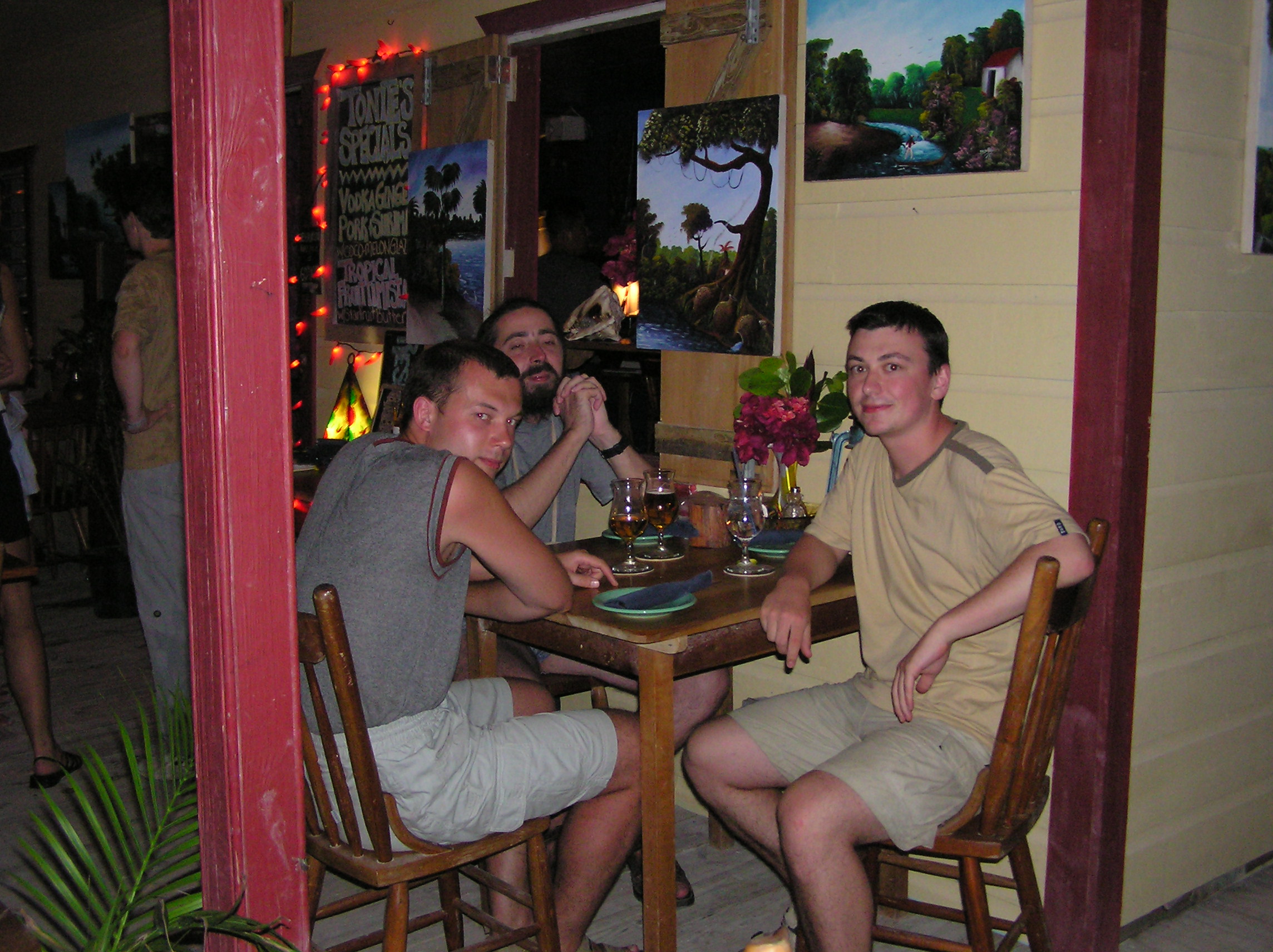 Na Caye Calker jsme dorazili okolo 17 hodiny, opláchli se a vyrazili do města na večeři. Chvíli jsme hledali, ale nakonec jsme zvolili restauraci Habanero, což byla skvělá volba. Já jsem si dal zeleninový salát, kluci rybu s pekelnými papričkami, asi nejpálivější co jsem kdy ochutnal. Jinak papričky se jmenují stejně jako název restaurace... V restauraci jsem poprosil barmanku o jednu společnou fotku, vyšla parádně (jedna z mála na kterých jsme všichni vyfocený). Po zaplacení jsme vyrazili domů. V noci přišla od moře pořádná vichřice, až jsem si říkal, že nám to určitě odnese střechu.