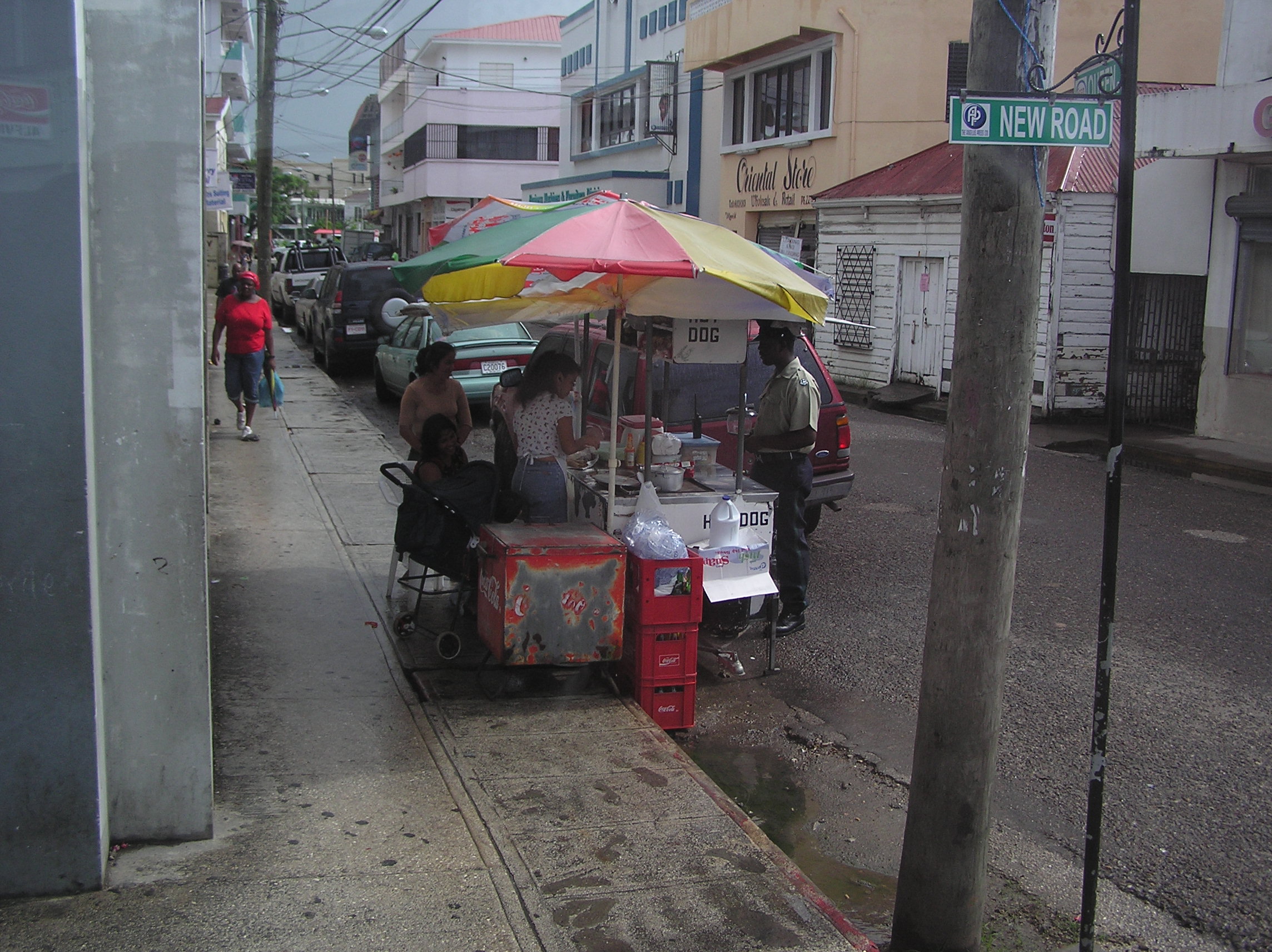 Do Belize City jsme dorazili okolo 20 hodiny a to už za plné tmy. Dle LP, řidiče i místních není autobusové nádraží zrovna bezpečné místo, natož po setmění. Nádraží bylo slušně zamřížovaný, okolo na plotech ostnatý drát. Před branou na autobusové nádraží postávali nepříjemní taxikáři - potomci černých otroků z Afriky. Hotel jsme už nějaký měli vybraný dle LP, ale na taxikářích bylo vidět, že nás tam odvést nechtějí. Pořád dokola nám doporučovali nějaký jejich spřízněný hotel, že vědí, kde je ten a o jiném hotelu, že nevědí. Byla už fakt slušná tma, téměr nikde světlo a nikoho nelákalo jít s batohy přes půl města. Tedy nám nezbylo nic jiného než využít jejich vyděračských služeb a jet s nimi. Taxikář si řekl o 5 dolarů za 4 minuty jízdy.