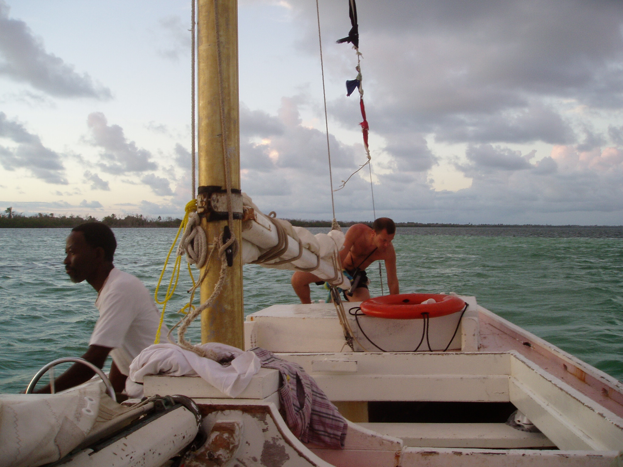 Prohlédli jsme si východní a jižní část ostrova a hlavní dvě silnice, spíše písčité cesty, které se jmenují jednoduše přední a zadní. Venku už začalo pořádně pražit sluníčko, tak jsem se otočil a šel se schovat do stínu v hotelu. Kluci prošli ještě západní část, která je však zarostlá stromy a naprosto nevhodná pro koupání. Cestou zpátky jsem se ještě stavil v internetové kavárně (20min = 4BZ), která měla vcelku slušně rychlé satelitní spojení s okolním světem. Než jsem si stačil vyřídit poštu a dorazit na pokoj, kluci už dorazili přede mnou a jelikož jsem měl klíč u sebe já, čekali na mne na verandě. Venku bylo nesnesitelné vedro, tedy jsme si na dvě hodinky lehli a dospali spánkový deficit z předešlé noci.