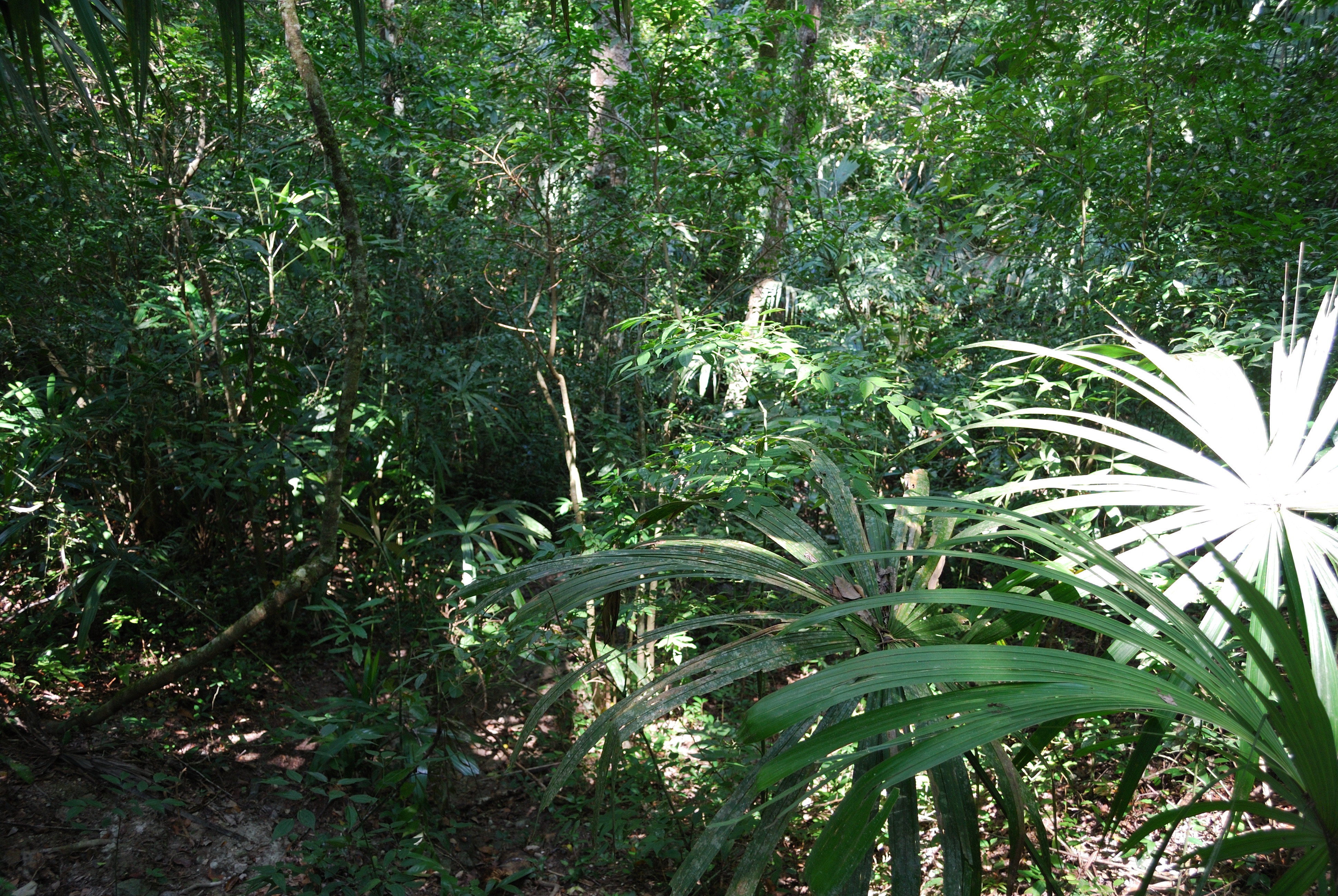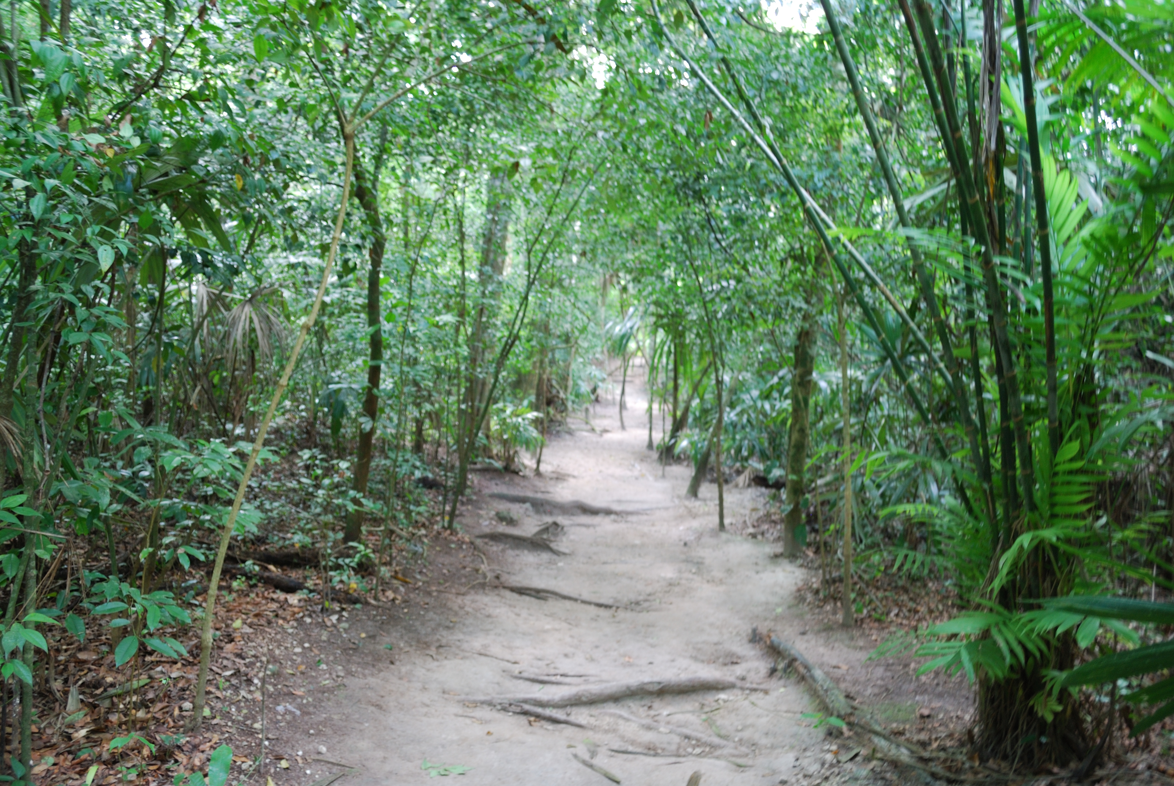 Projeli jsme posledním městečkem El Caoba a dál už byla jen silnička skrz deštný prales. Po cca 8 kilometrech jsme dojeli k bráně národního parku Tikal. Stráž parku na nás jen mávla a pokračovali jsme dalších 18 kilometrů deštným pralesem. Občas jsme podél silnice míjeli cedule upozorňující na výskyt divokých šelem. Konečně jsme dorazili k parkovišti. Řidič nám jen řekl, že dle barvy zpáteční jízdenky nás vezme zpět jiný řidič a čas kdy odjíždí poslední minivan.