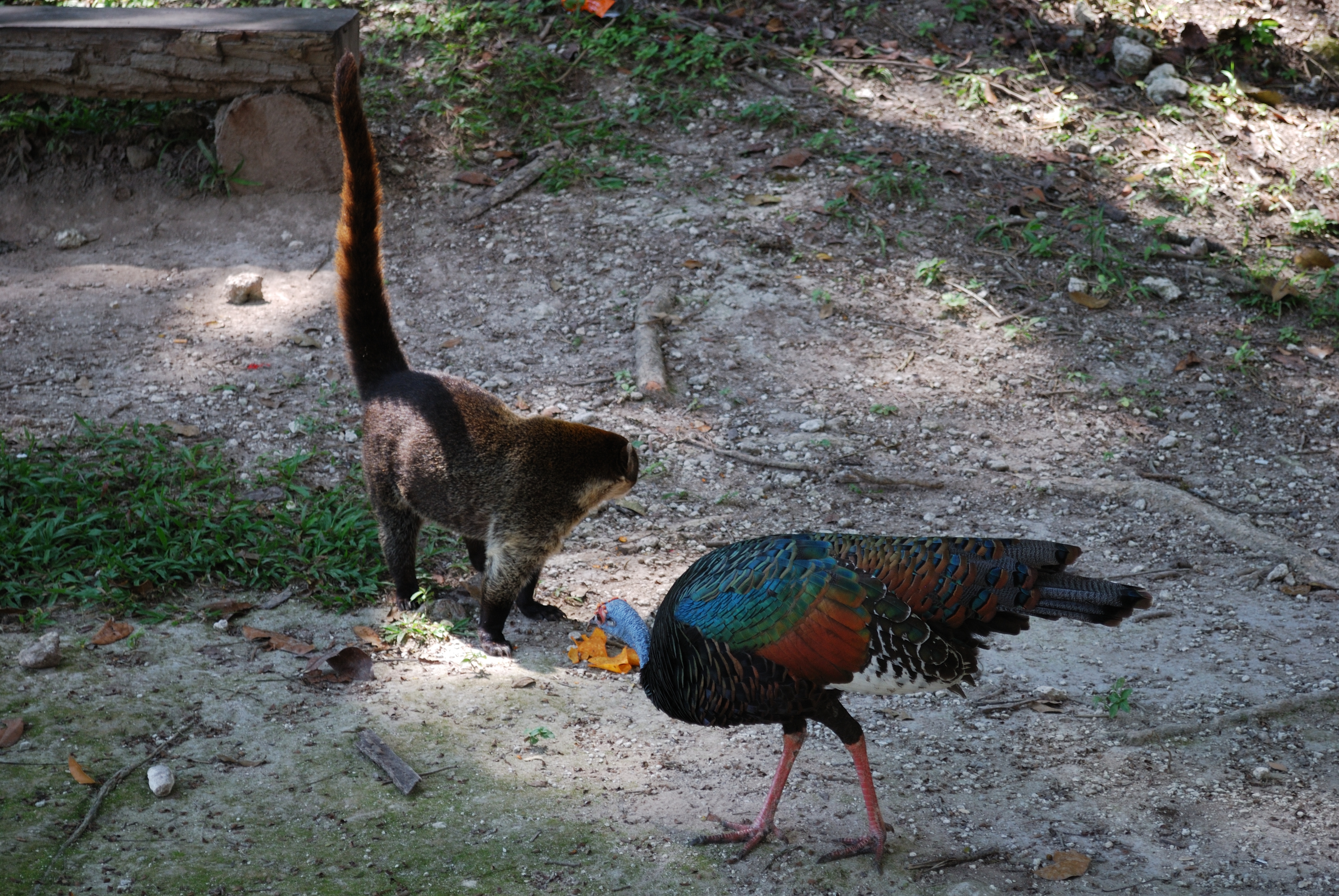 Před námi se nosálové přetahovali o kousky nalezených zbytků ovoce s krocanem pávím. Krocan se držel dál, ale když nosálové nadávali pozor, sebral jim kus ovoce a popoběhl stranou.