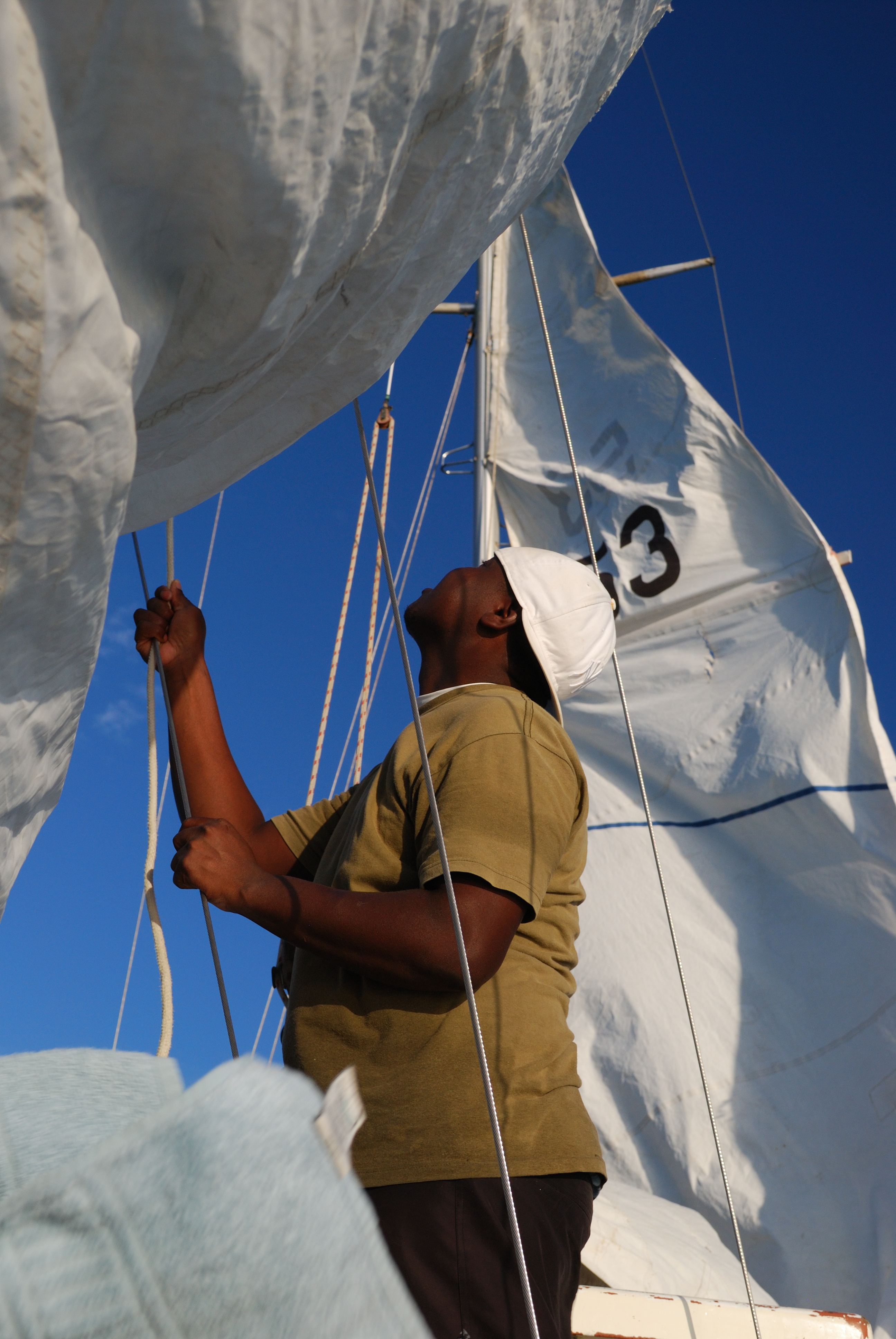 My se však plavili jen ke korálovým útesům. K místu šnorchlování je to zhruba hodina po moři. Protože začal foukat trochu vítr, kapitán vypnul motor a posádka napnula plachty. Musím přiznat, že plachtění je mnohem více příjemné. Je slyšet jen rozrážení vln a není takový rachot od motorů.
