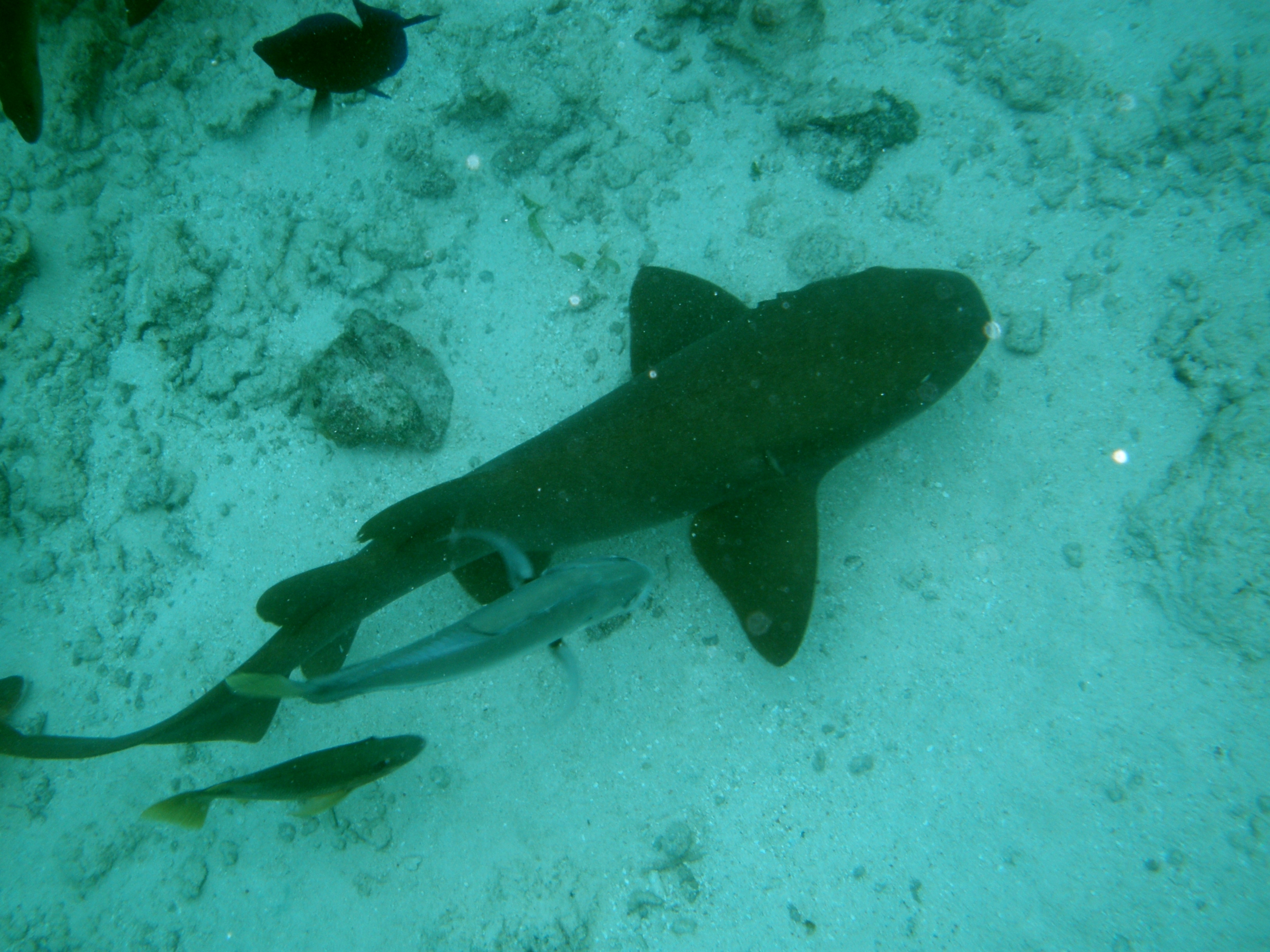 Dokonce připlaval i malý žralok - nurse shark. Podařilo se mi dotknout alespoň jeho hřbetní ploutve. Nevypadal nijak útočně, spíše se bál hromady turistů. Snad nemá někde poblíž větší příbuzné...
