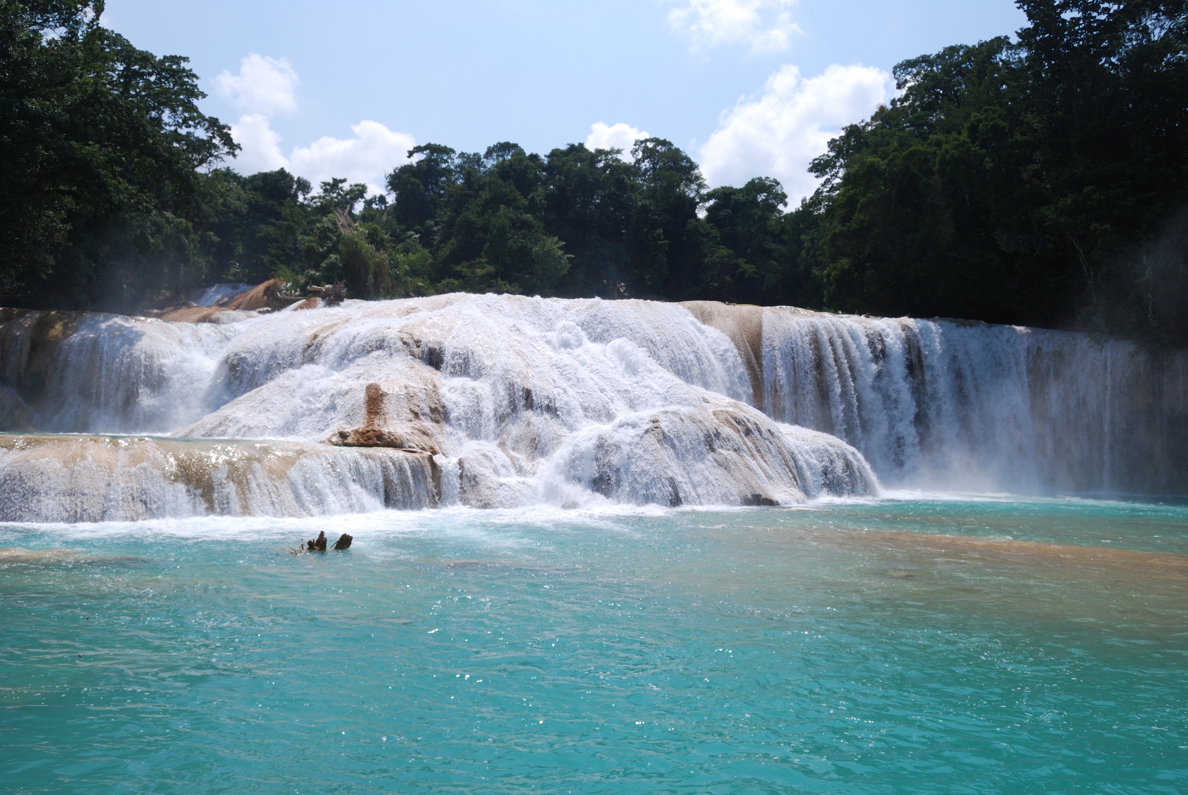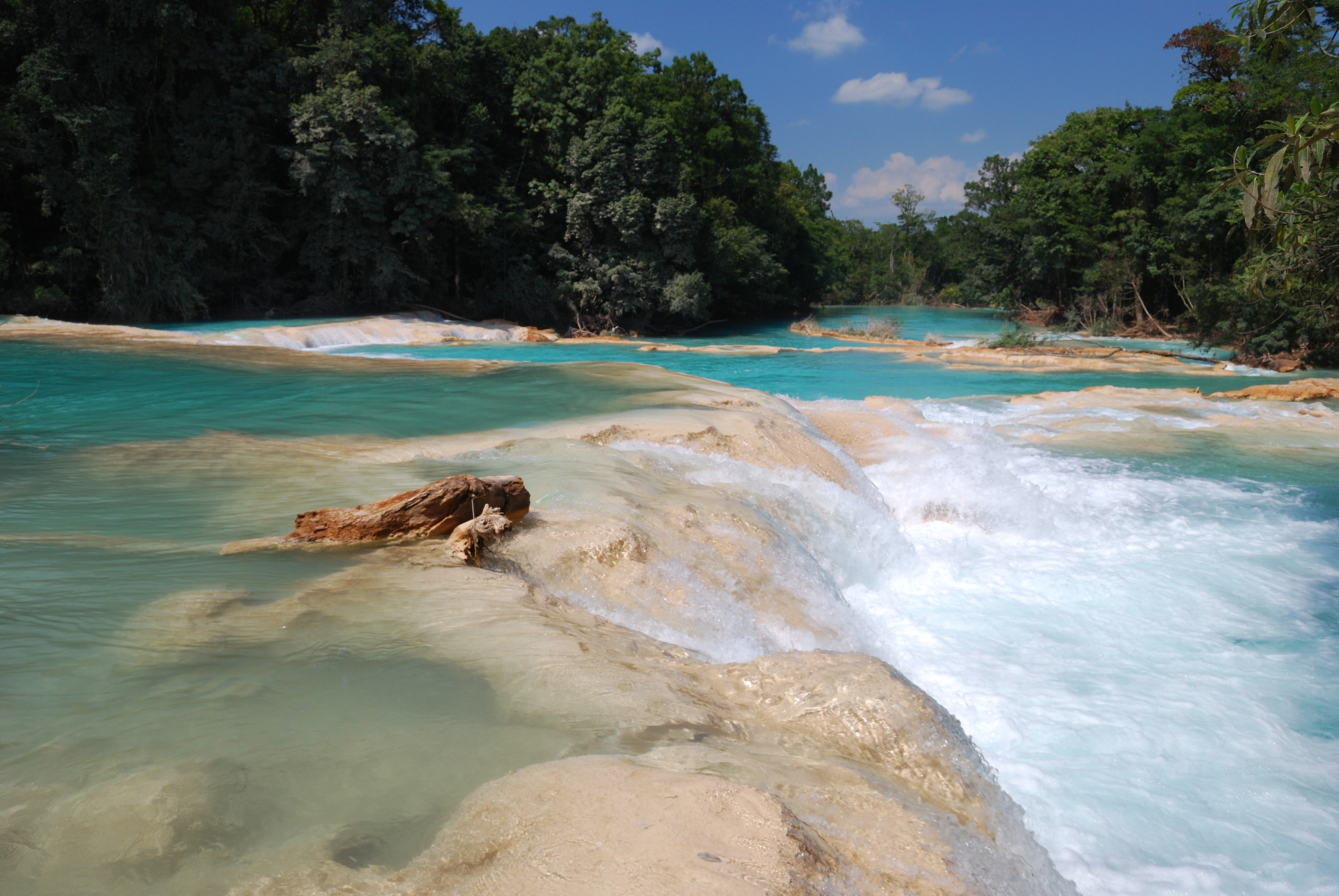 Vodní kaskády Aqua Azul jsou dlouhé asi kilometr a tvoří je mnoho malých vodopádů. Tyrkysová barva vody je zapříčiněna minerálním složením podloží, kde se do vody uvolňuje uhličitan vápenatý.