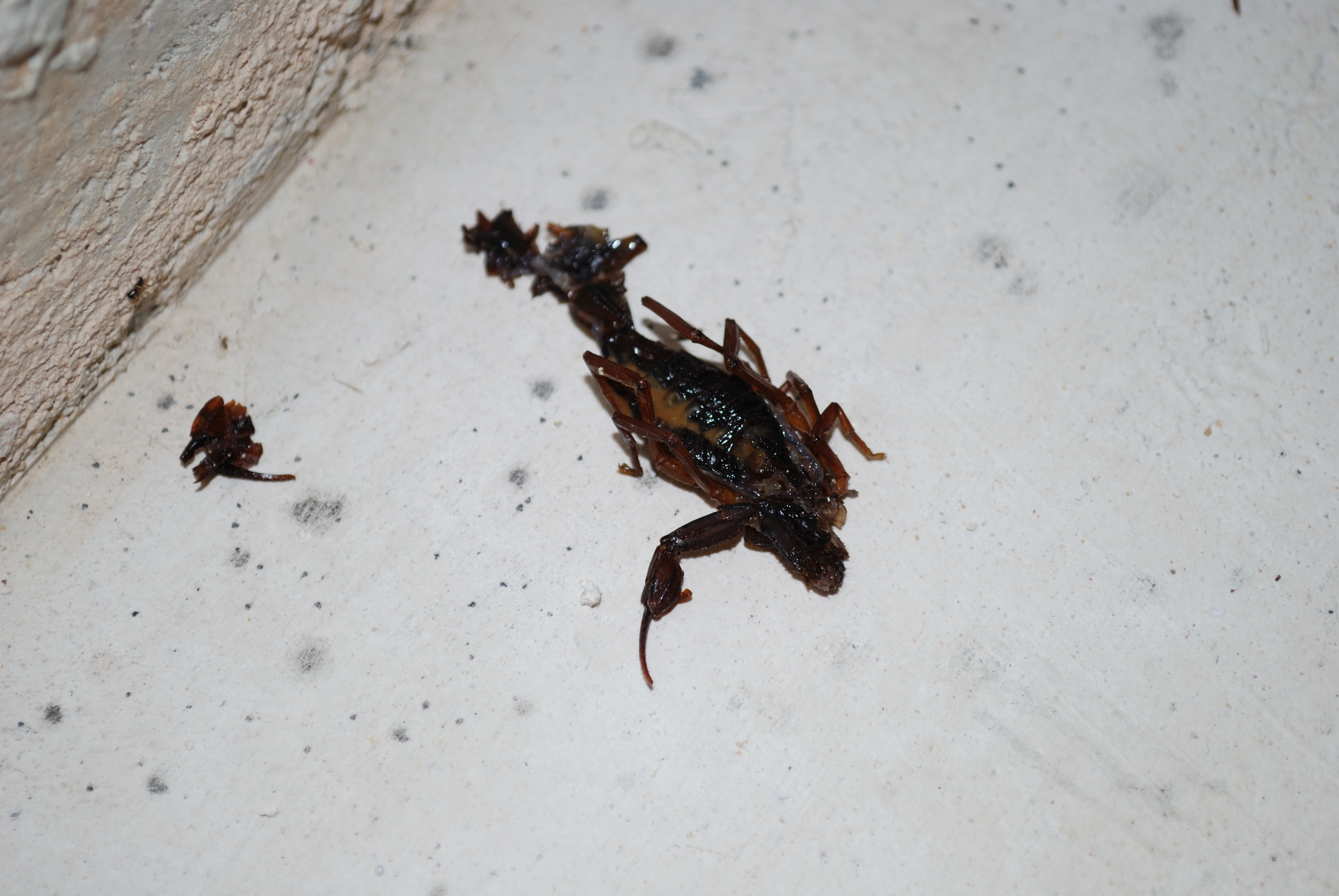 Vstal jsem a ještě rozsvítil světlo. Prošel jsem okolo matrace a koukám, že na boku mé matrace je něco černého. Koukám ještě trochu blíže co to je a zjištění mne opravdu šokovalo. Byl to asi 10 centrimetrů dlouhý škorpión. Vzal jsem botu a zlikvidoval ho. Jen škoda, že mne nenapadlo si ho vyfotit před jeho anihilací. Na fotografii už mám jen jeho zbytky. Spát s tímhle v posteli. Kdybych se tam nepodíval, byla by téměř jistota, že ho v noci přimáčknu nohou. On se nemohl dostat ven, protože okolo nás byla moskytiéra.
