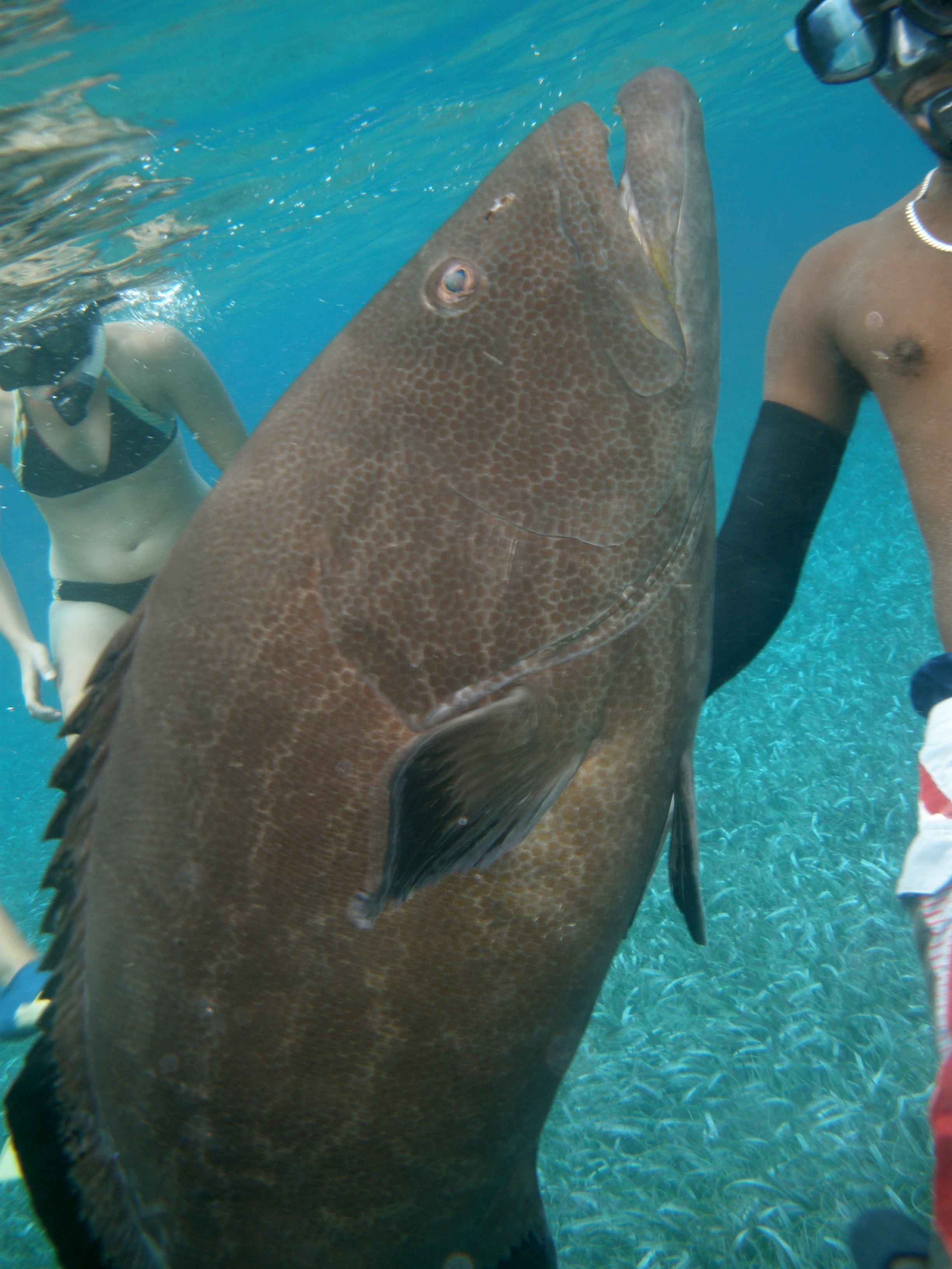 Po pár minutách bylo okolo nás spousta pestrobarevných ryb od malých kusů až po 1.5 metrové kusy (Grouper na obrázku dorůstá i 2.5 metru).