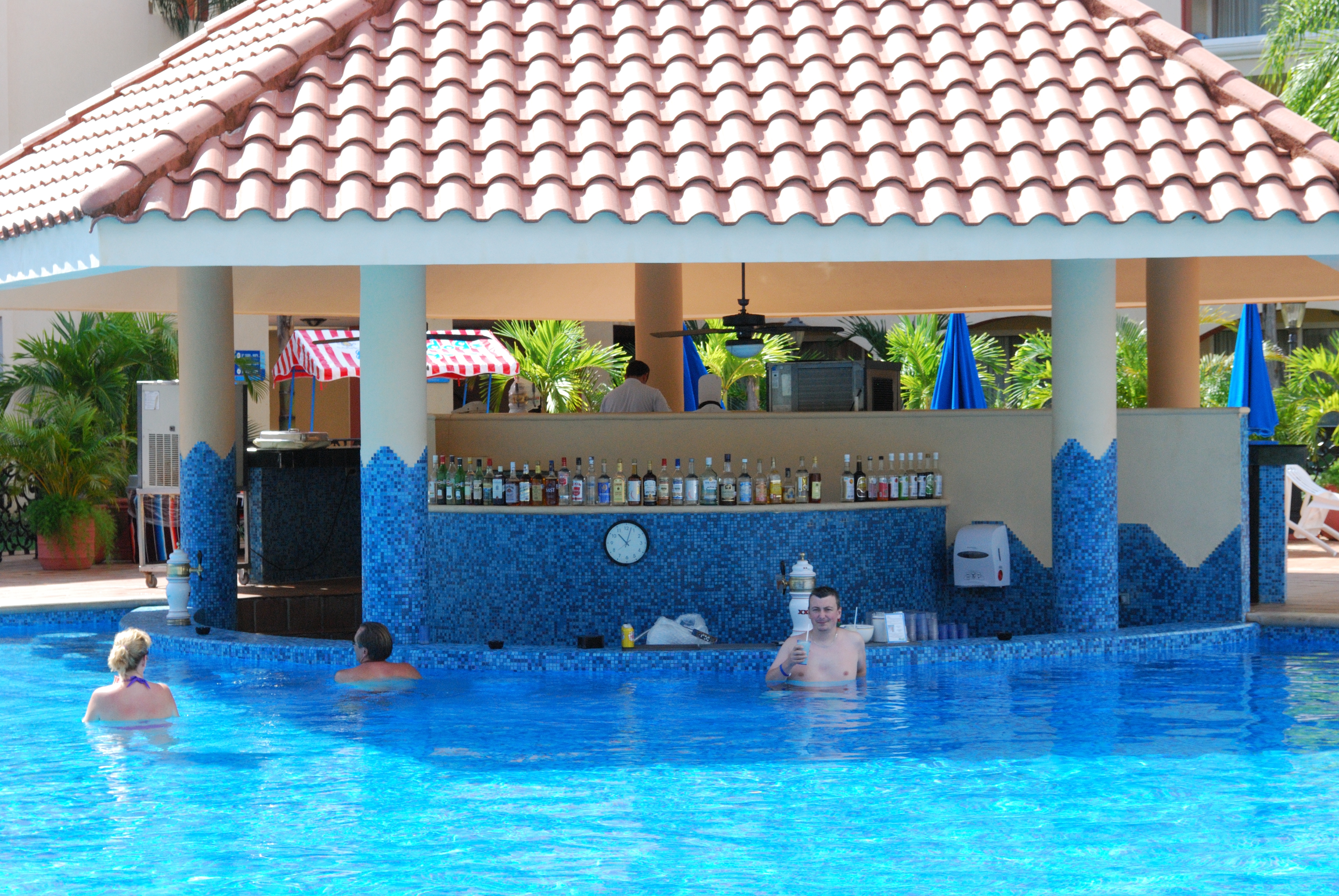 Po výtečné snídani jsme se šli koupat do bazénu. Uprostřed bazénu byl bar s židličkami ponořenými ve vodě. Alkoholické míchané nápoje se daly tedy objednat přímo z vody a taktéž je ve vodě v neomezeném množství rovnou konzumovat. Ráj to pro alkoholiky. :-)