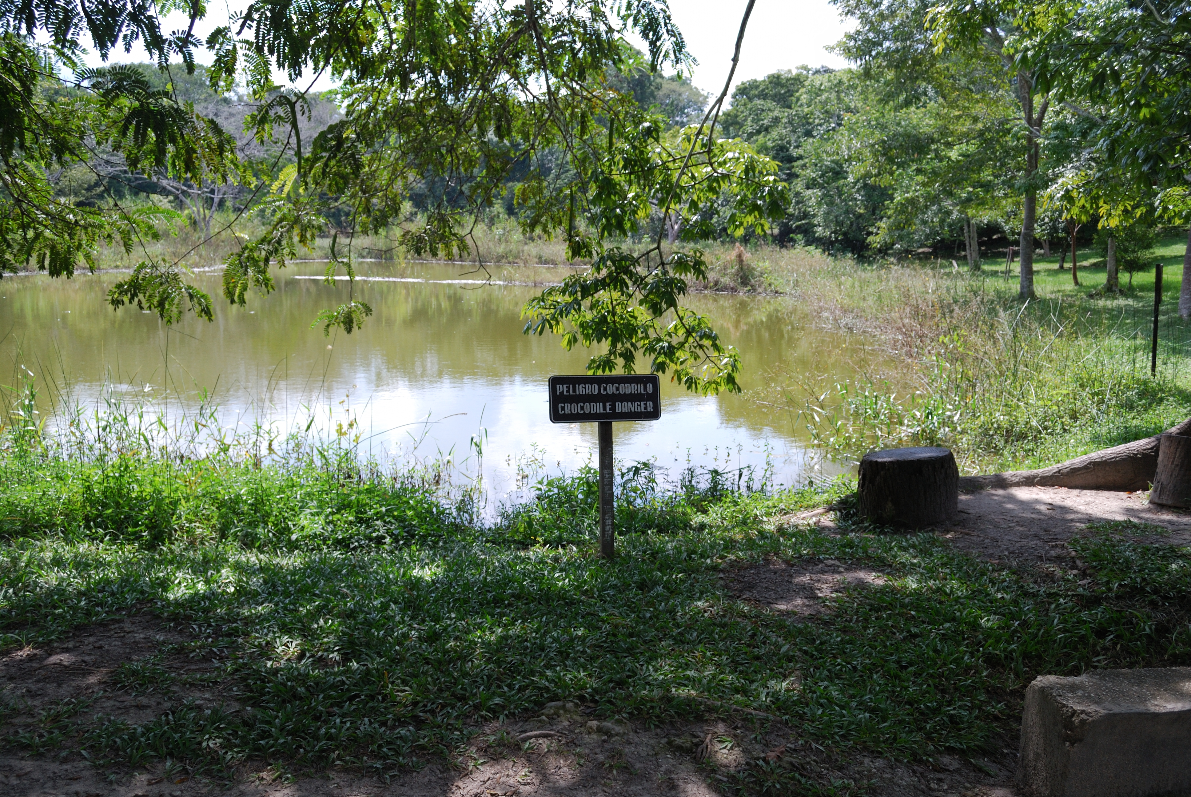 Při opouštění areálu jsme procházeli okolo malého jezírka. Zaujala nás cedulka "Peligro cocodrilo". Tak oni tu jsou i krokodýli? Koukali jsme do vody i na břeh, ale žádného krokodýla jsme neviděli. Jelikož jsou krokodýli chladnokrevní, tedy nemají teplotní regulaci, tak velkou část dne se vyhřívají na březích. Avšak nikde nic k vidění nebylo. No blíž k vodě raději chodit nebudeme, zas až na tak blízké setkání nejsme zvědaví.